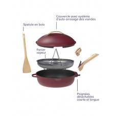• Inclus : 2 poignées détachables (une longue et une courte), un panier vapeur et une spatule en bois.