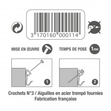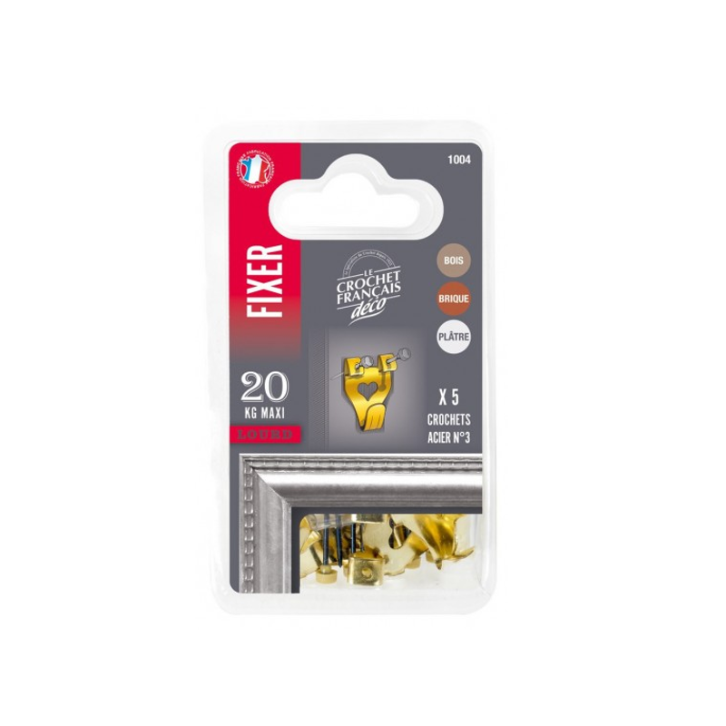 Ces crochets vous permettent de fixer aisément tableaux et cadres de poids moyen. Des crochets en acier laitonné, des pointes en acier trempé pour les fixer : une résistance optimum qui convient parfaitement aux supports tels que le bois, les plaques ou carreaux de plâtre, béton cellulaire et les briques creuses.