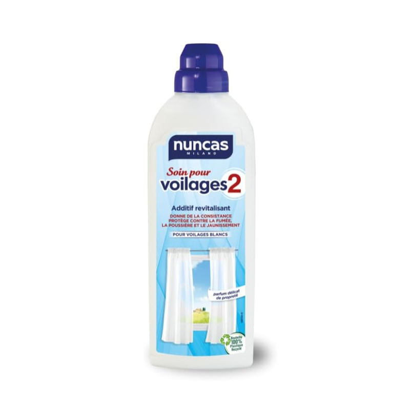 Entretien spécifique des rideaux blancs, cet additif revitalisant s'utilise lors du rinçage final en machine ou à la main. Il forme un film protecteur sur les fibres textiles, empêchant la poussière, les odeurs et les salissures de s'y fixer. Grâce à ses propriétés, il donne du volume aux voilages, redonne de la tenue au tissu et facilite le repassage. Il convient à tous types de matières, naturelles ou synthétiques, et respecte les tissus les plus délicats. Son action préserve la blancheur et évite le jaunissement dû à l'exposition lumineuse. Il diffuse un parfum frais dans la pièce au séchage, pour un résultat visuel et olfactif optimal.