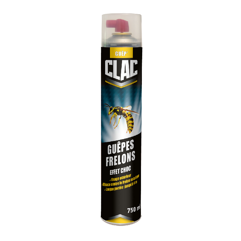 Cet aérosol Guêpes Frelons Effet Choc Clac est aussi efficace contre frelons asiatiques et autres insectes volants, produit un jet puissant portant jusqu'à 4 m.